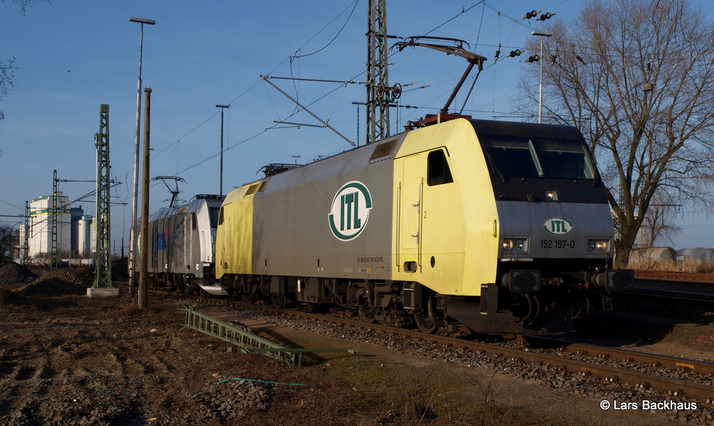 152 197-0 ITL und 185 562-6 ITL setzen sich am 09.03.14 vor ihren Kesselwagenzug auf der Hohen Schaar in Hamburg.