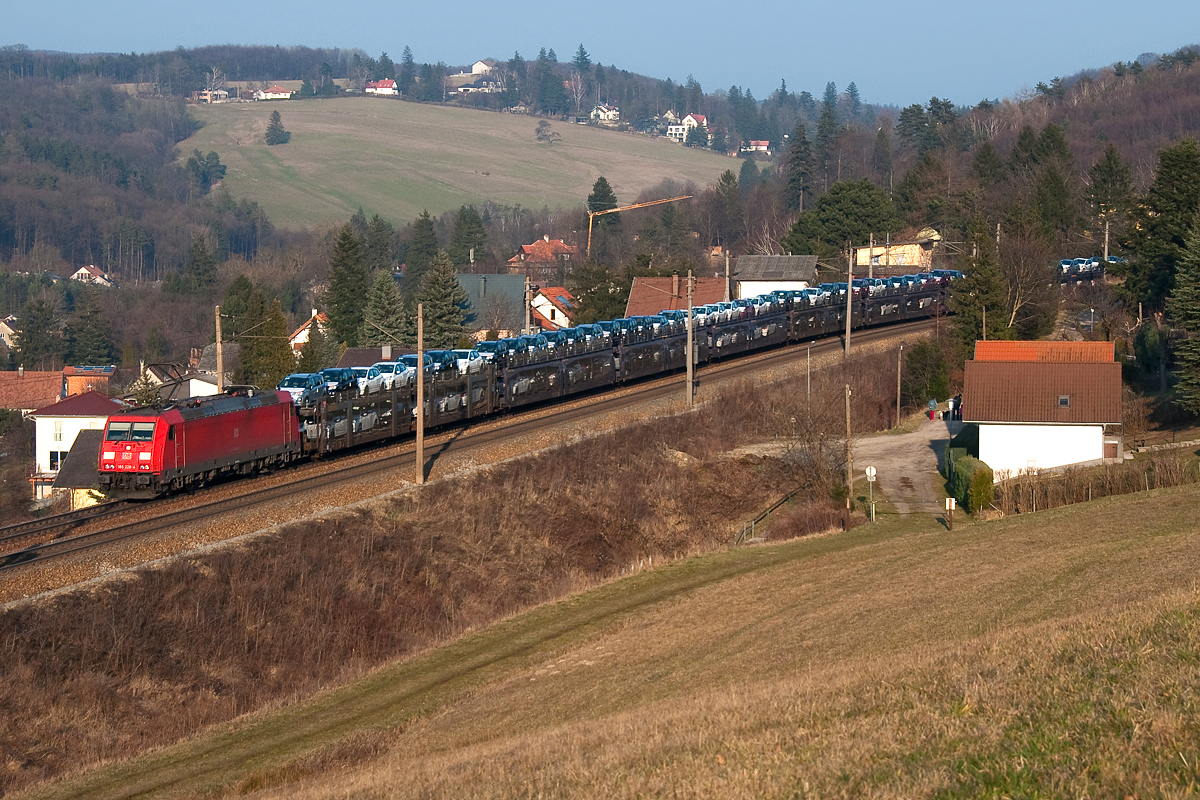185 228 ist mit einem Gefco Autoganzzug (Peugeot) bei Eichgraben-Altlengbach in Richtung Westen unterwgs. Die Aufnahme entstand am 09.03.2014.