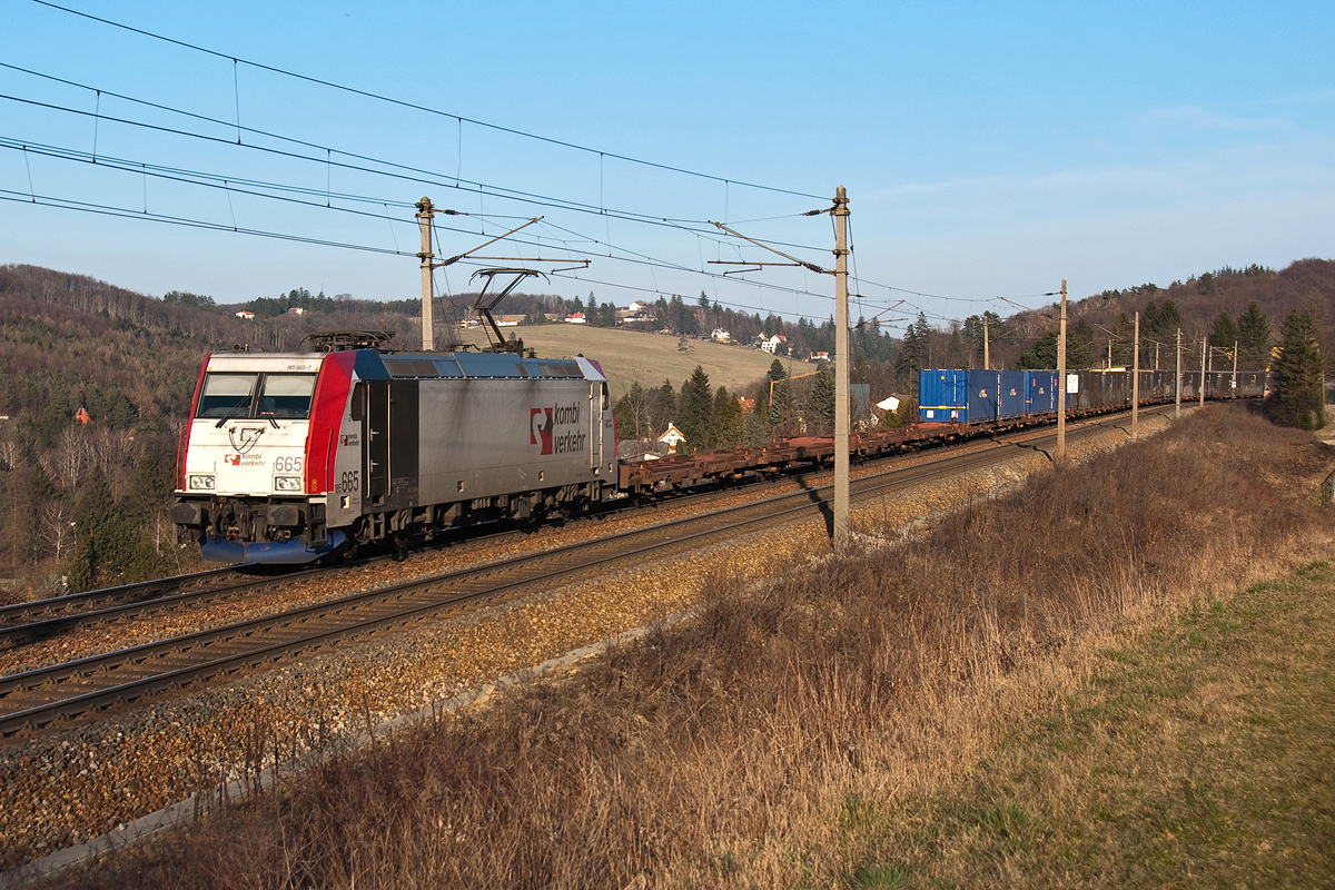 185 665 "Kombiverkehr" ist mit einem Containerzug bei Eichgraben in Richtung St. Pölten unterwegs. Die Aufnahme entstand am 10.03.2014.
