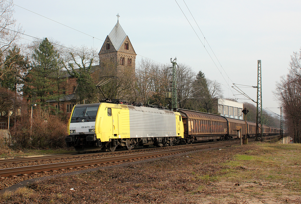189 912-9 "Cream Moving Europe" ist mit einem Getreidezug bei Eichgraben-Altlengbach Richtung Westen unterwegs. Die Aufnahme entstand am 10.03.2014.