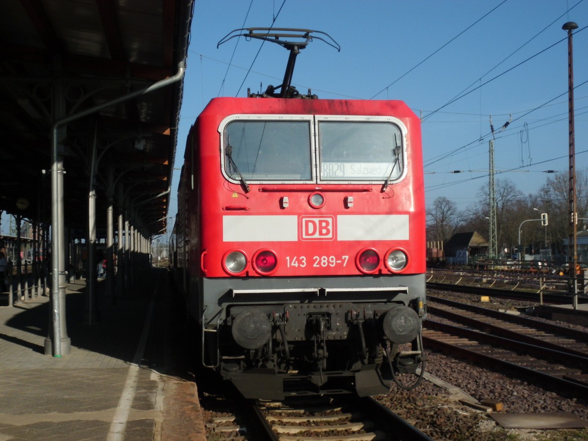 Am 09.03.2014 war 143 289 mit der RB 29 in Stendal auf Gleis 5.