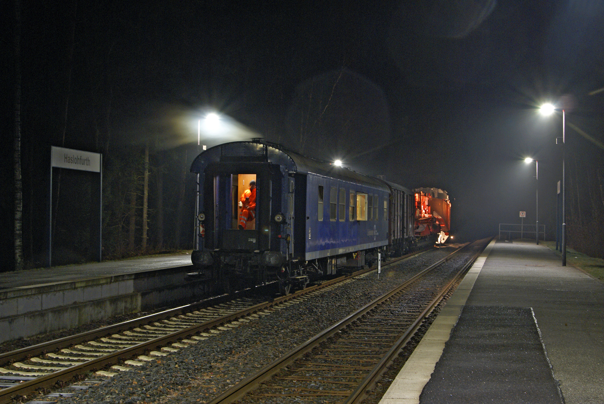 Am 3.02.2014 war um 6 Uhr  für den Trafozug zum Umspannwerk Friedrichsgabe das Ziel fast erreicht: Mit dem LÜ-Begleitwagen vorraus fährt der Zug in die Station Haslohfurth ein, hier zweigt das Anschlussgleis zu o.g. Umspannwerk ab.