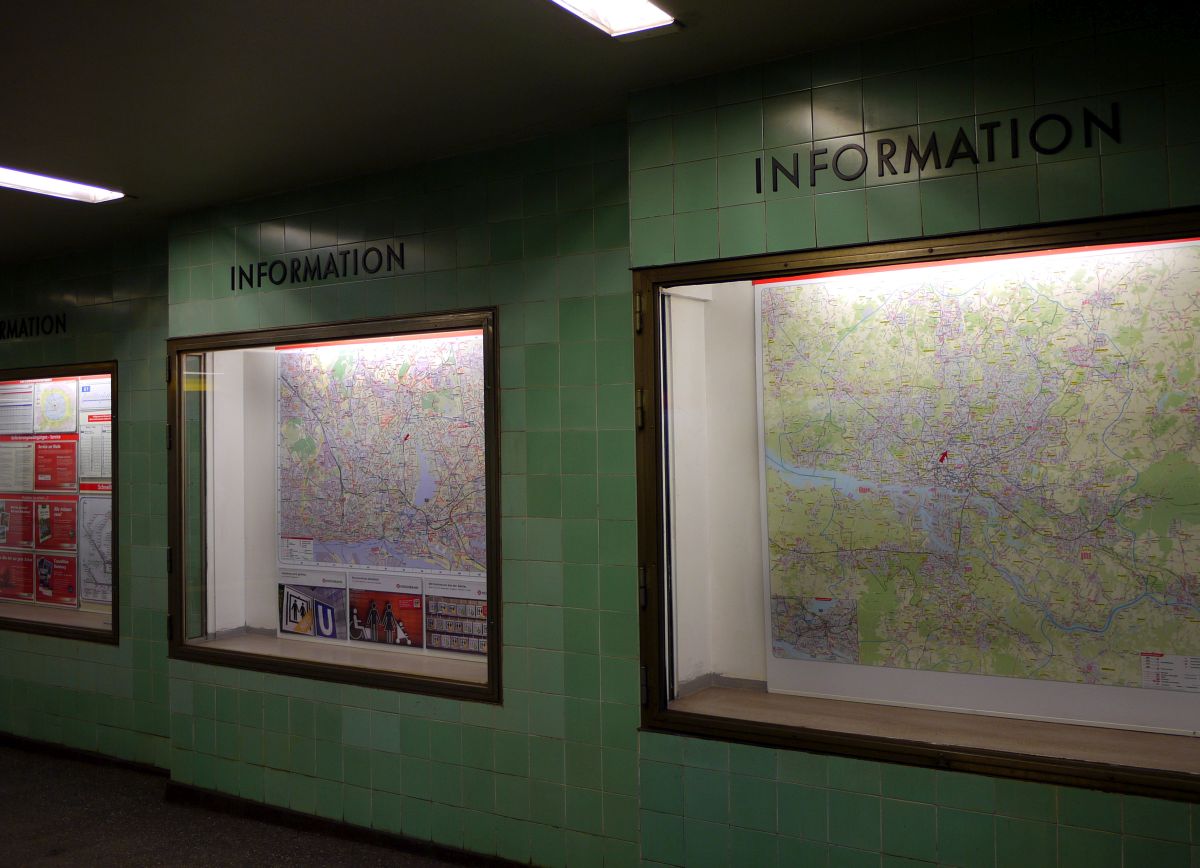 Art-Deco im Hamburger Untergrund: Schaukästen in der südlichen Schalterhalle der U-Bahnhaltestelle "Klosterstern", Baujahr 1929. 9.3.2014
