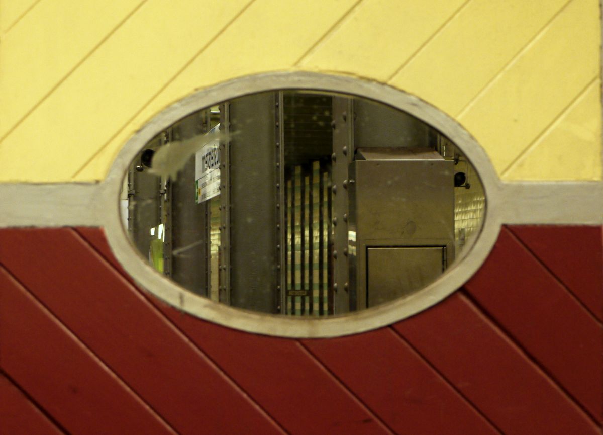 Art-Deco im Hamburger Untergrund: verspiegelte Scheibe im holzvertäfelten Betriebshäuschen der U-Bahnhaltestelle "Klosterstern". 9.3.2014
