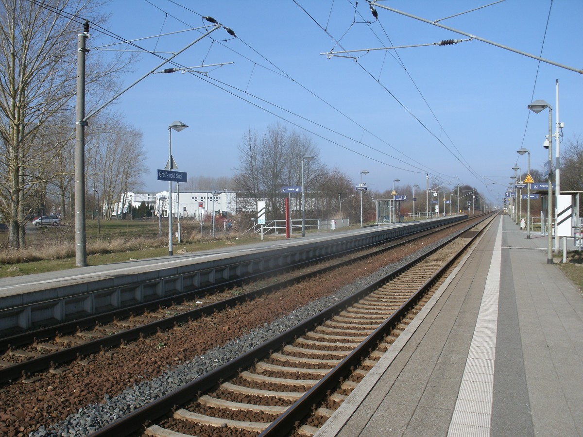 Der Bahnsteig Richtung Süden an der Station Greifswald Süd am 09.März 2014.