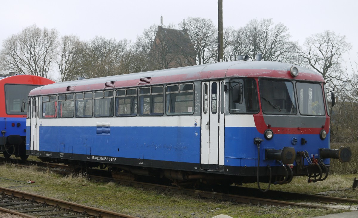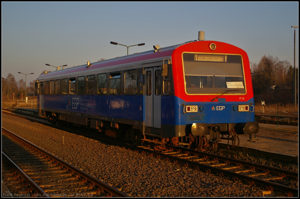 EGP VT 43 / 626 043 als RB73 Neustadt (Dosse) macht am 10.03.2014 in Pritzwalk Feierabend. Angetrieben wird der Triebwagen von einem MAN-Motor vom Typ D 2866 TUH mit 213 kW und einem Voith Turbogetriebe T 2115 (NVR-Nummer 95 80 0626 043-3 D-EGP)