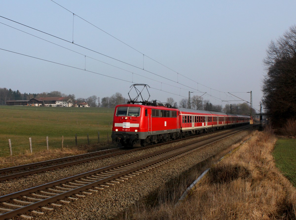 Die 111 021 mit einem M nach Salzburg am 08.03.2014 unterwegs bei Vogl.