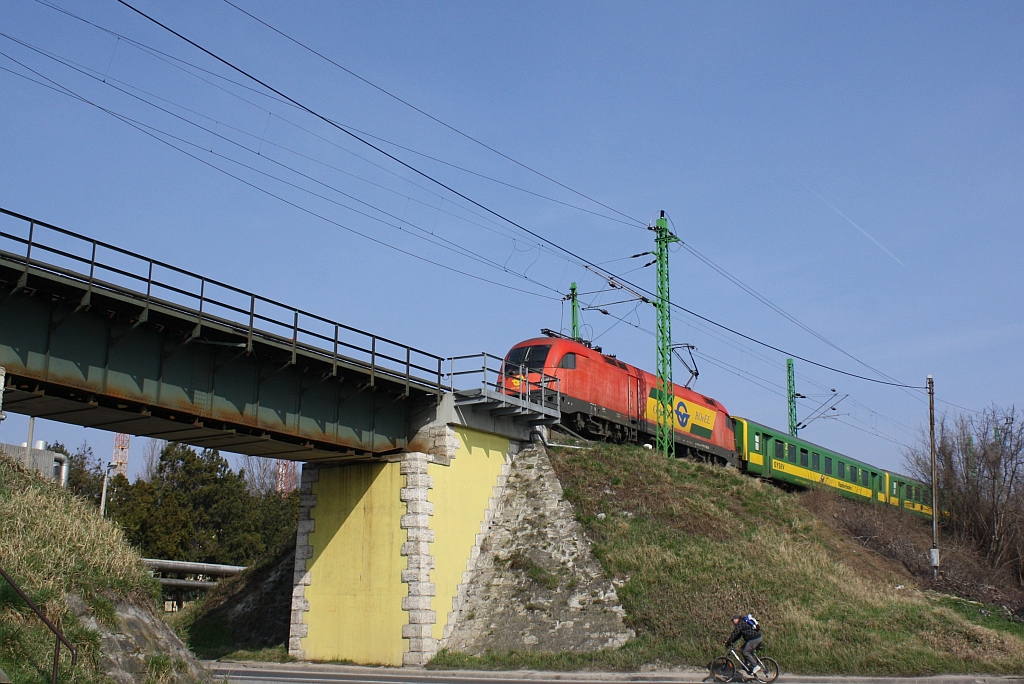 Die neu lackierte, für den CD-Railjetdienst vorgesehene 1216 233 war am 08.03. 2014 mit dem EC 71 "Gustav Mahler" von Prag nach Wiener Neustadt unterwegs, und wurde bei der "Kaiserbrücke" in Guntramsdorf fotografiert.
