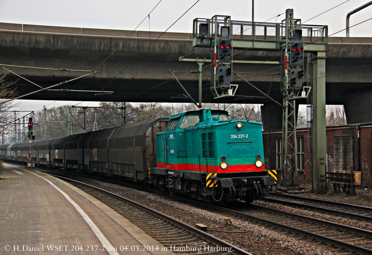 214 003-6 LOCON hat in Hamburg-Waltershof einen kurzen Übergabezug übernommen und bringt diesen in den Hafenbahnhof Alte-Süderelbe. Aufgenommen am 09.03.14 in Hamburg-Waltershof.