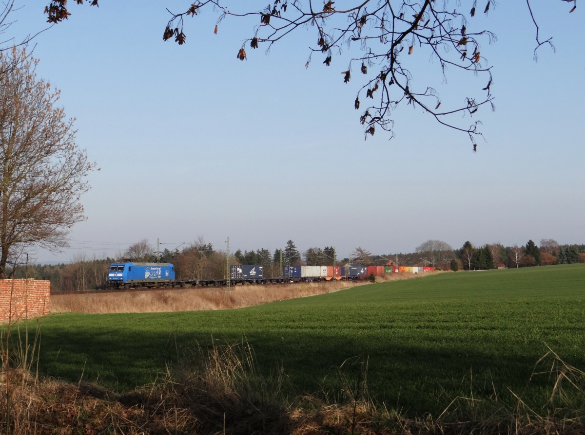 185 612-9 Emons Bahntransporte GmbH mit einem Containerzug in Demker und fuhr in Richtung Magdeburg weiter. 13.03.2014