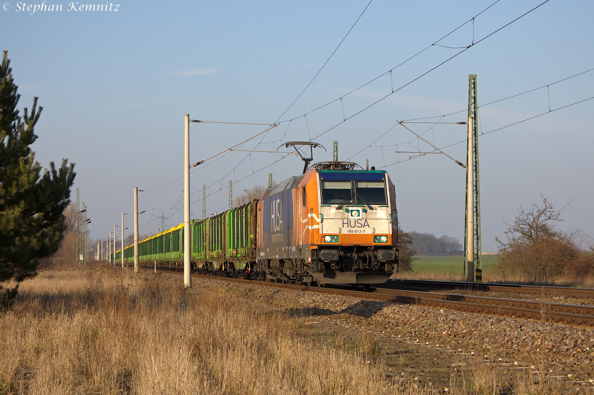 185 613-7 RBSAF - RBS Asset Finance Europe Limited für OHE Cargo GmbH mit einem leeren Holzzug in Demker und fuhr in Richtung Magdeburg weiter. Die 185 613-7 fungierte kurzfristig als Ersatz, für die am 12.03.2014 defekt gewordene E 186 137. 13.03.2014