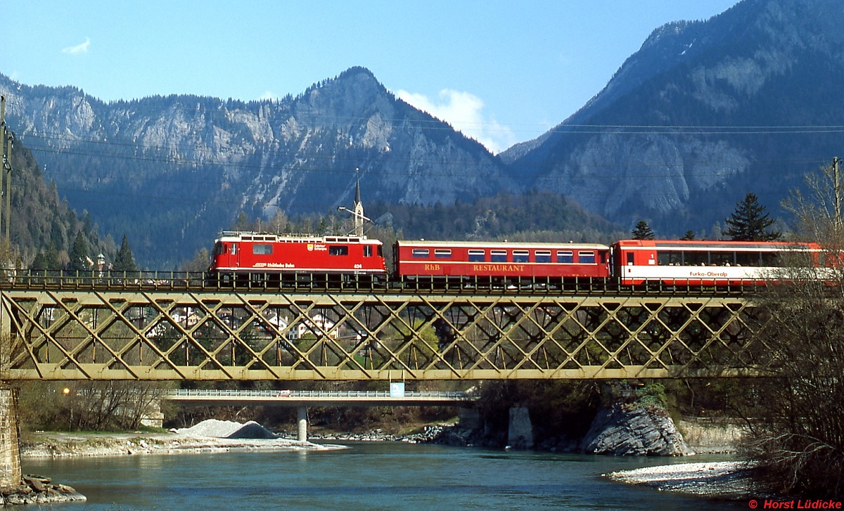 Am Zusammenfluss von Voderrhein und Hinterrhein bei Reichenau-Tamins wurde Ge 4/4 II 624 im April 1996 vor dem Glacier Express aufgenommen. Erster Wagen hinter der Lok ist ein Restaurantwagen der Rhätischen Bahn, dahinter ein Aussichtswagen der Furka-Oberalp-Bahn.
