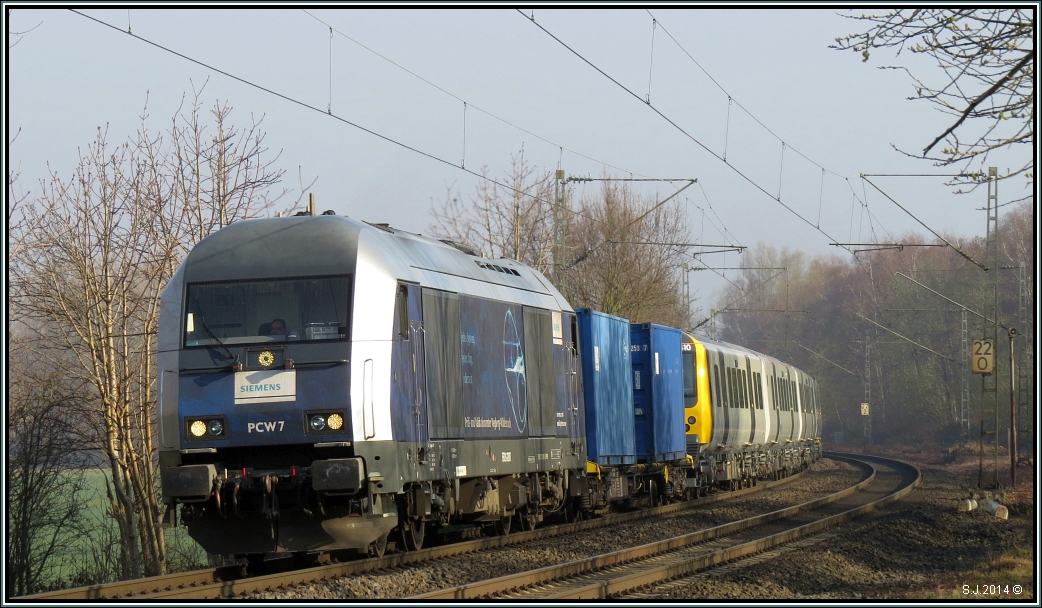 Auf Überführungsfahrt nach Aachen West unterwegs,die Siemens Lok PCW7 mit Schutzwagen und einen britischen Triebwagen am Haken.Hier zu sehen bei Rimburg auf der Kbs 485 unweit der niederländischen Grenze,am 12.März 2014.