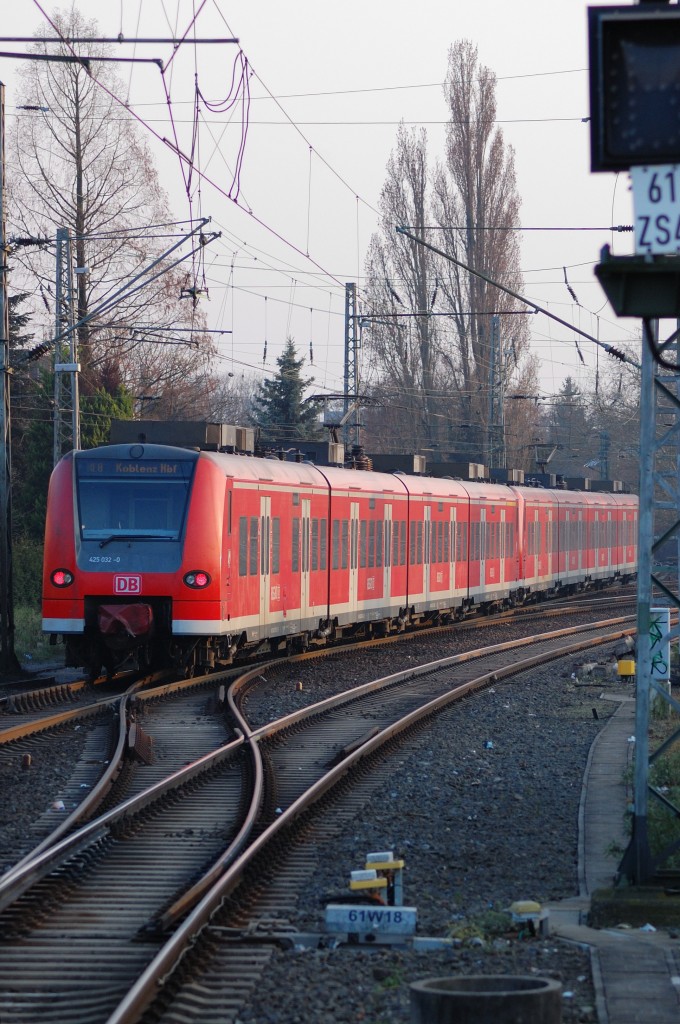 Auf der Weichenstraße in Rheydt Hbf biegt ein RE8 Zug nach Koblenz in den Odenkirchener Zweig ein. Als Schlußwagen ist der 425 032-0 am Donnerstag den 13.3.2014 zu sehen.