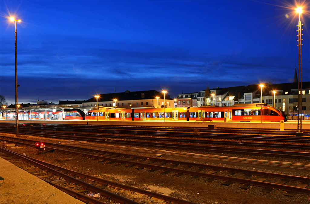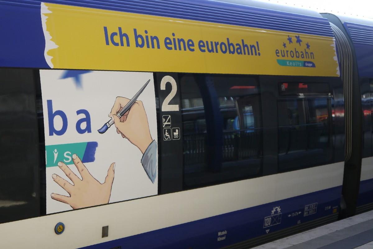 Einige der Talente, die die Eurobahn von anderen EVU übernommen hat, um die neu gewonnenen Strecken in Ostwestfalen damit zu betreiben, entsprechen nicht dem Eurobahn-Standard. Dieser soll bis Sommer 2014 hergestellt sein. So lange gibt's Sprüche statt Corporate Identity. Im Bild (Bielefeld, 13.3.14) VT 3.03, FER 95 80 0 643 126-5, der ehemalige VT 722 der NWB.