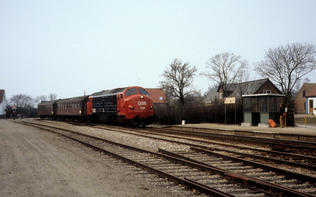 DSB: Die Mx 1029 kommt am 9. April 1979 mit zwei Personenwagen in Bording an. - Bording ist ein Städtchen auf der Bahnstrecke zwischen Herning und Silkeborg in Mitteljütland. Heute wird diese Strecke von Arriva-Zügen (LINT 41) bedient.