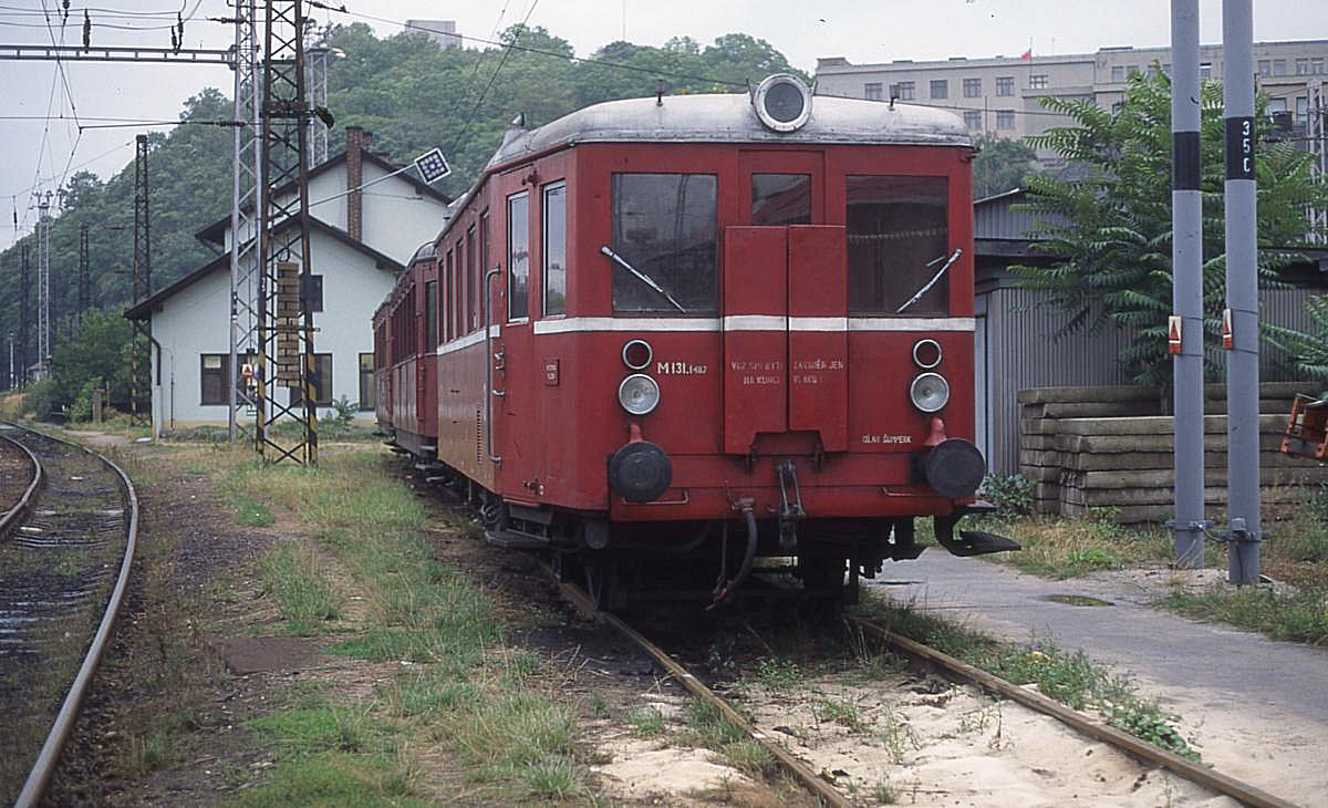 M 131.1487 mit weiteren Bei- bzw. Motorwagen am 1.9.1995 im Depot des Bahnhofs Praha Masarykovo.