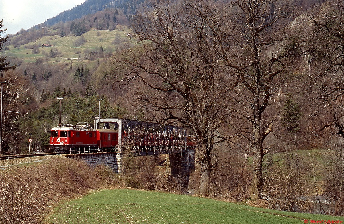 Zwischen Versam-Safiens und Reichenau-Tamins überquert Ge 4/4 II 632 im April 1996 den Vorderrhein