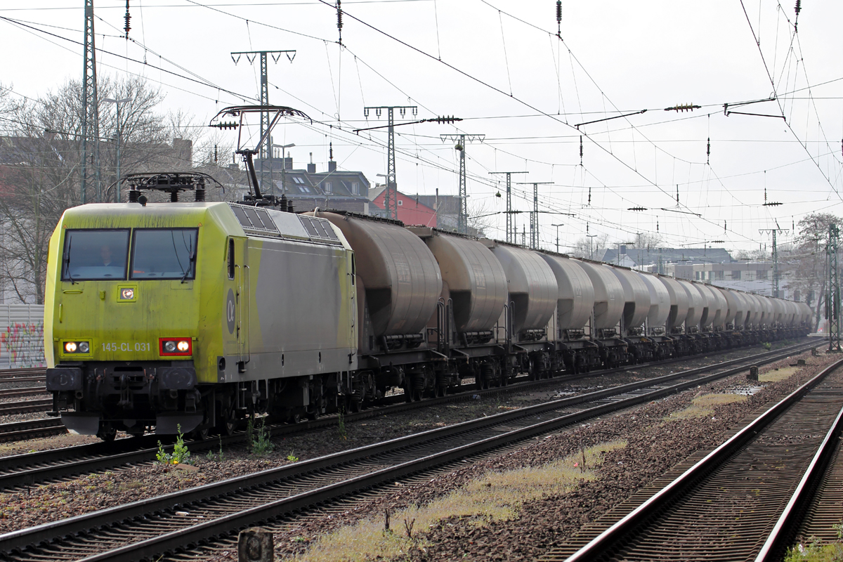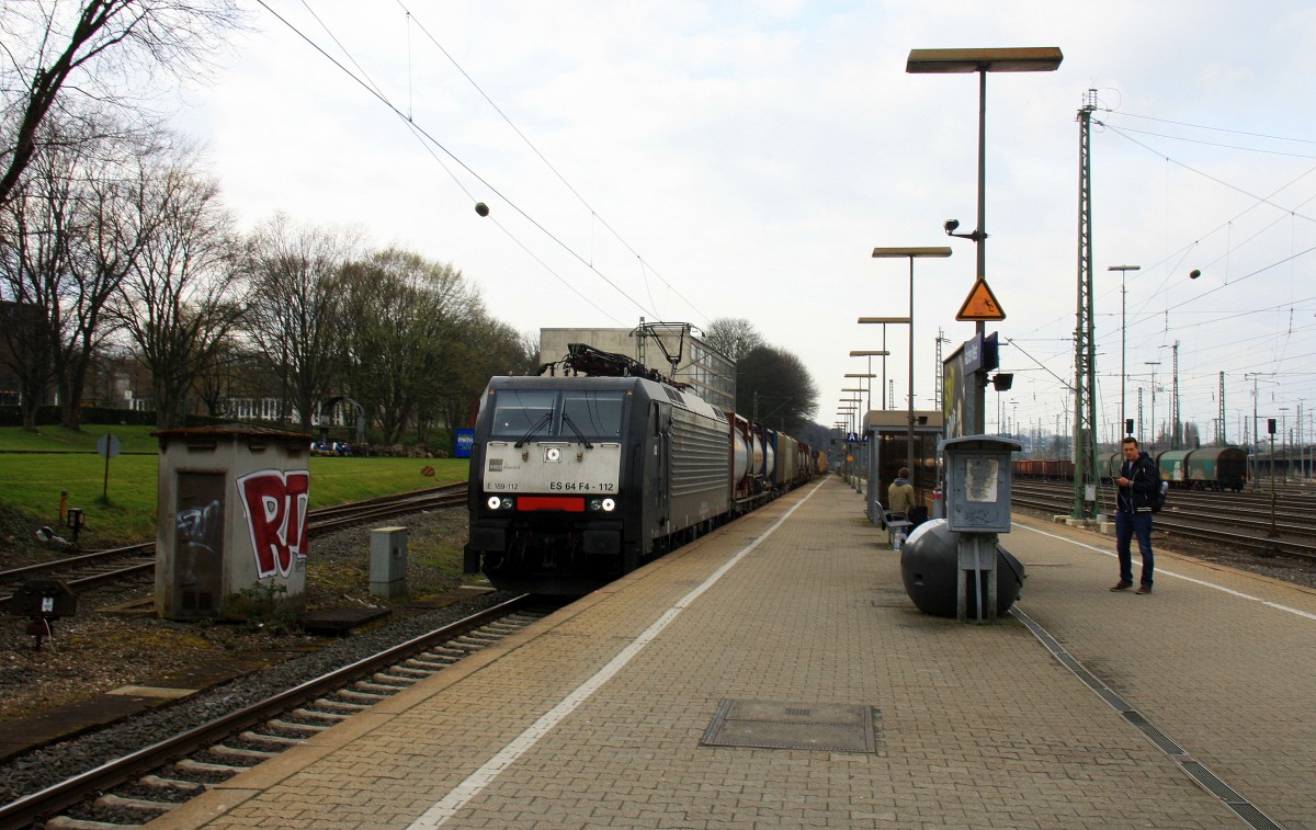 189 112 von MRCE kommt als Umleiter aus Richtung Neuss mit einem langen Containerzug und durchfährt den Bahnhof Aachen-West auf Gleis 1 und fährt in Richtung Aachen-Hbf,Köln bei Sonne und Regenwolken am 15.3.2014.