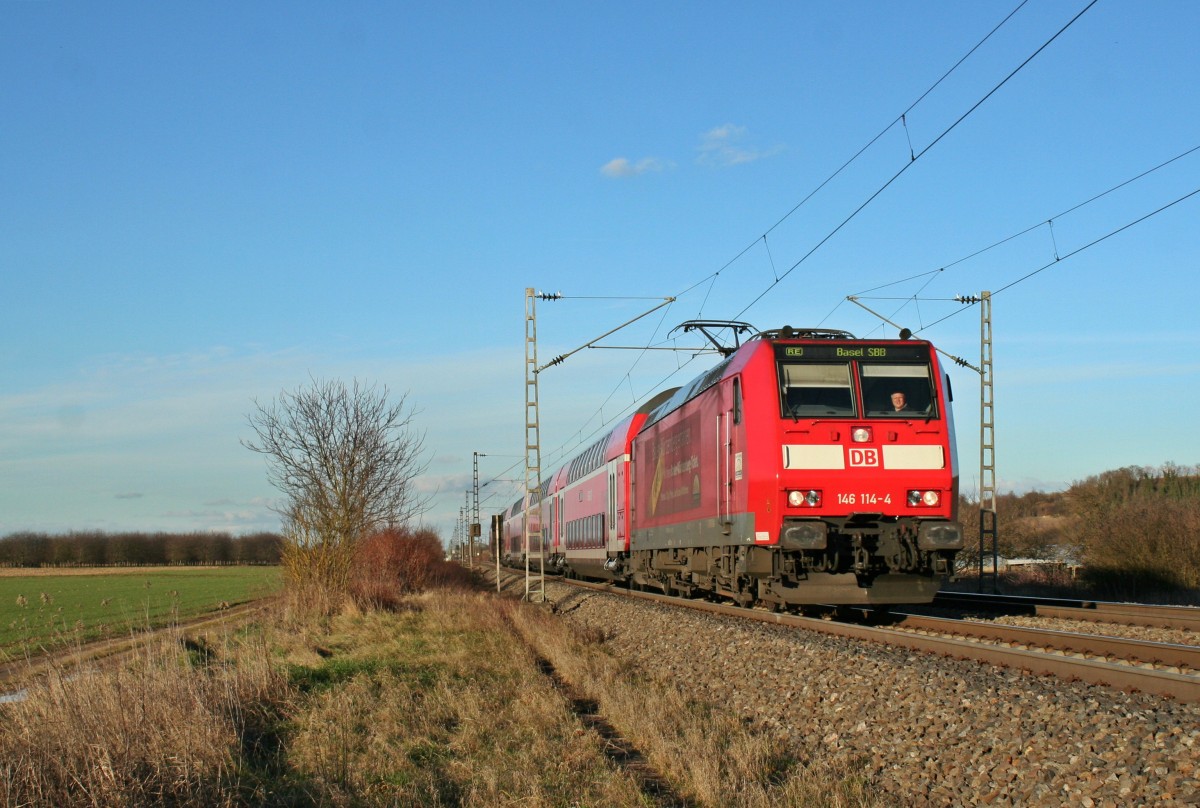 146 114-4 mit einem RE von Offenburg nach Basel SBB am Nachmittag des 11.02.14 bei Hügelheim.