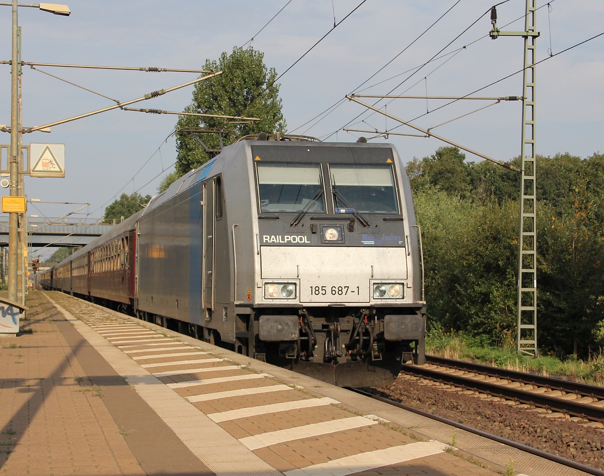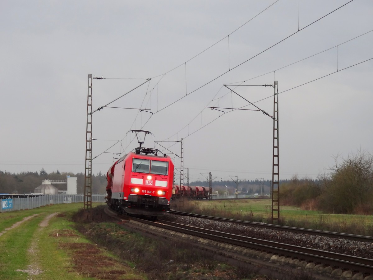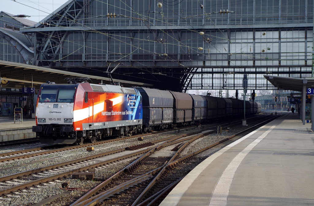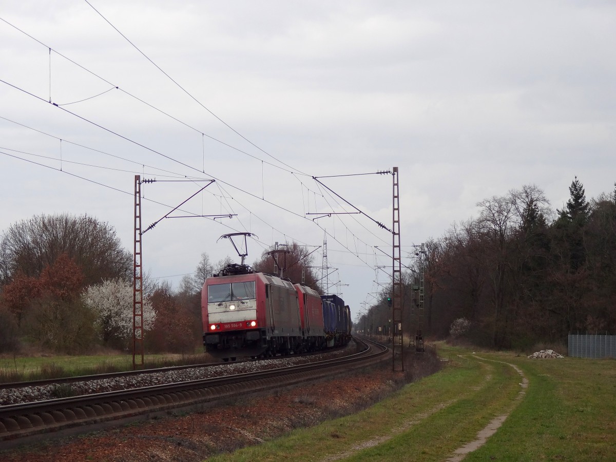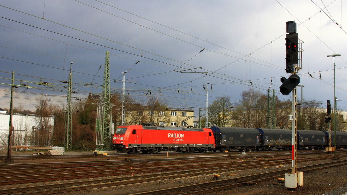 185 304-3 von Railion kommt aus Richtung Köln,Aachen-Hbf mit einem Kurzen Coilzug aus Linz-Voestalpine(A) nach Genk-Goederen(B) Aufgenommen vom Bahnsteig in Aachen-West bei Sonne und Regenwolken am 15.3.2014.