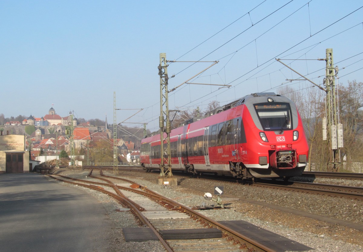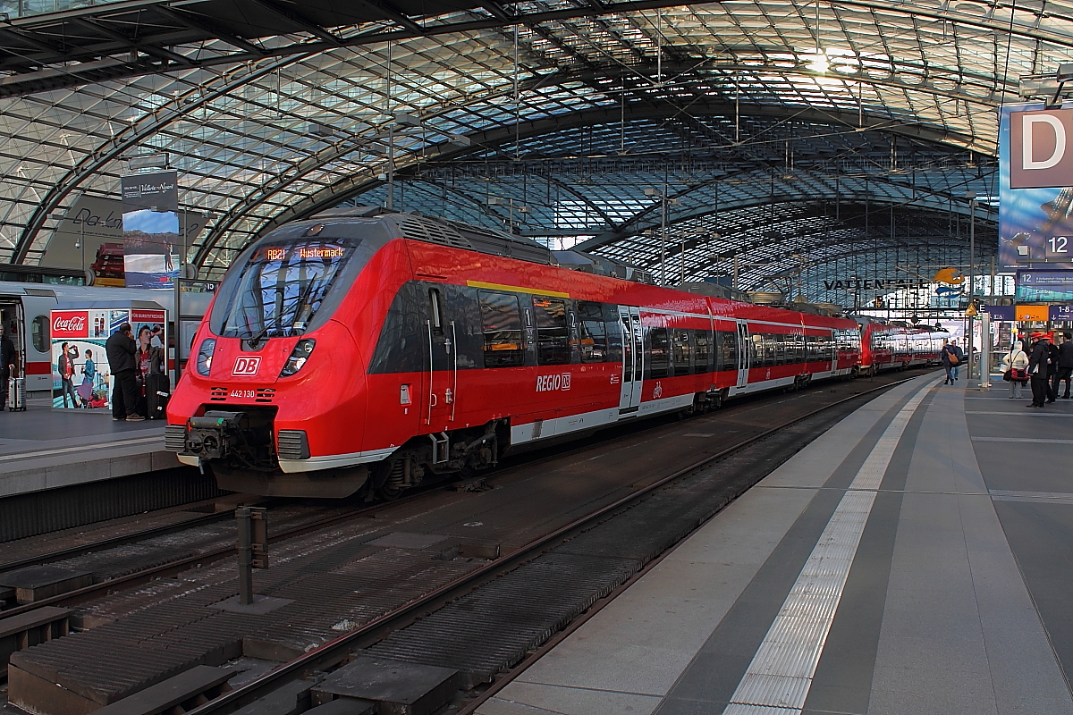 Der 442 130 auf der RB 21 als RB 18674 von Berlin Friedrichstraße nach Wustermark, der zweite Zugteil wird in Golm getrennt und fährt als RB RB 28826 Berlin-Schönefeld Flughafen. Hier beim Halt am 14.03.2014 in Berlin Hauptbahnhof.