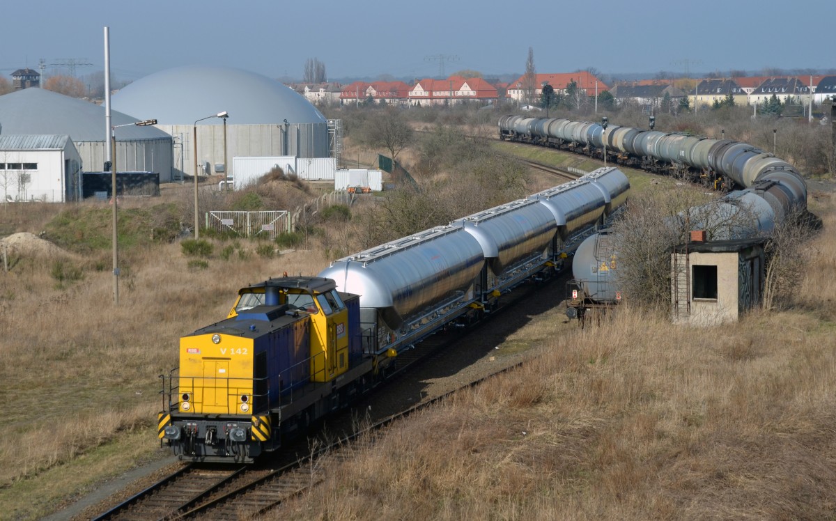 Am 09.03.14 schiebt V 142(293 900) der RBB vier Silowagen in den Chemiepark Bitterfeld.
