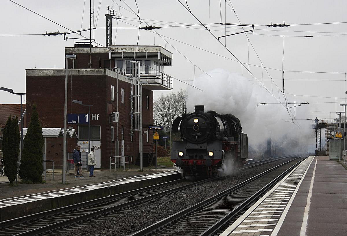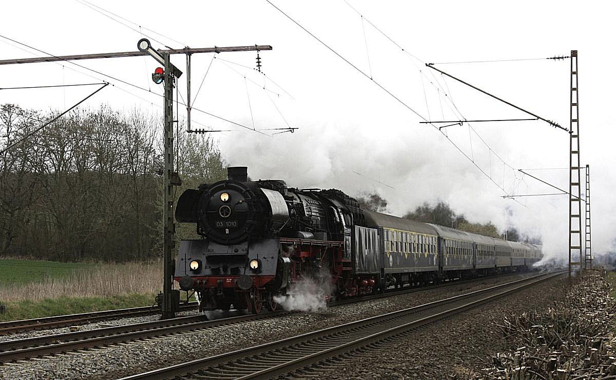 Durchaus auch trüb kann der Frühling in Norddeutschland sein, wie das Foto eines von 218 369-7 gezogenen IC bei Bekdorf am 4.04.2009 zeigt.