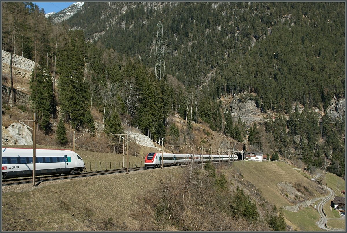Begegnung der ICN 668 Basel SBB - Lugano und ICN 10014 Lugano - Zürich oberhalb Wassen. 14. März 2014