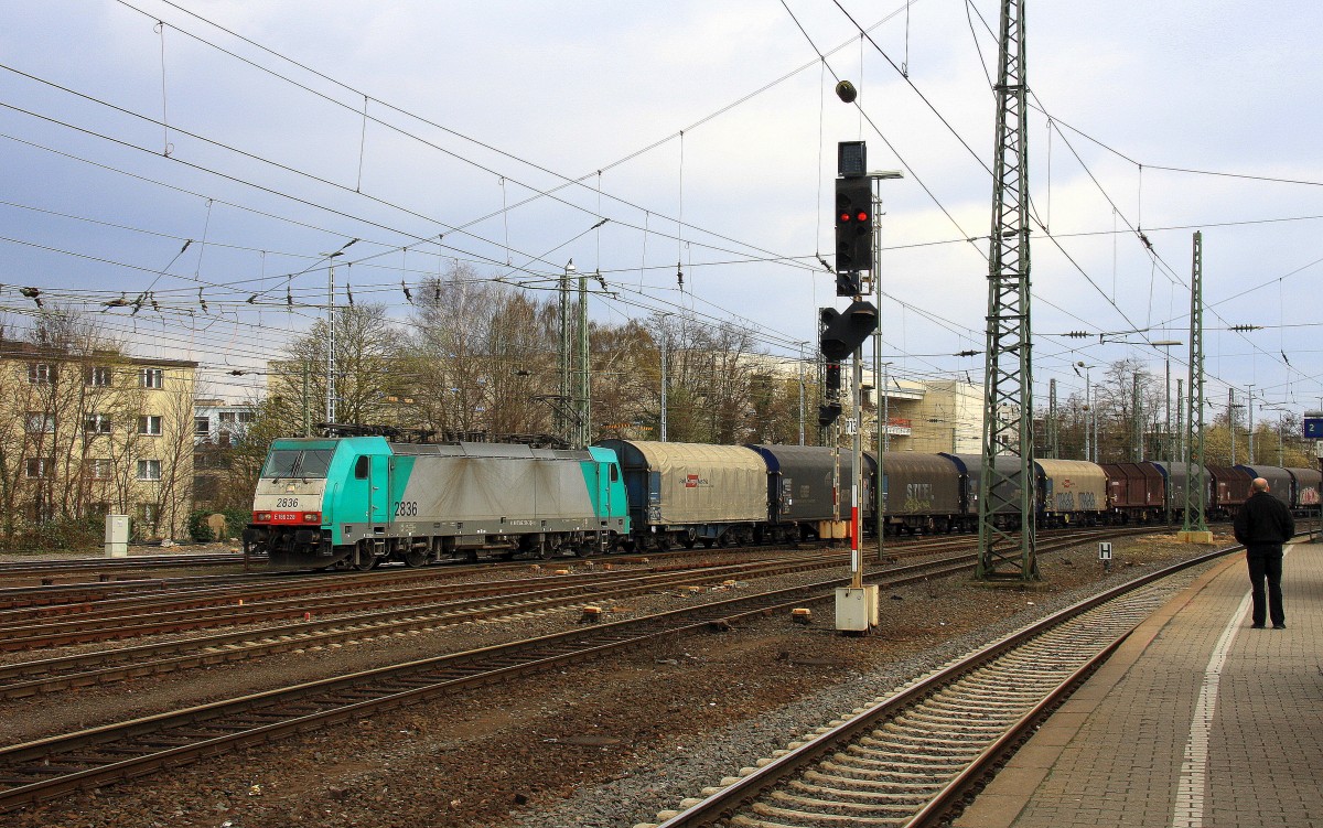 Die Cobra 2836 kommt aus Richtung Montzen/Belgien mit einem langen gemischten Güterzug aus Antwerpen-Noord(B) nach Köln-Gremberg und fährt in Aachen-West ein. Aufgenommen vom Bahnsteig in Aachen-West bei Sonne und Regenwolken am 15.3.2014.
