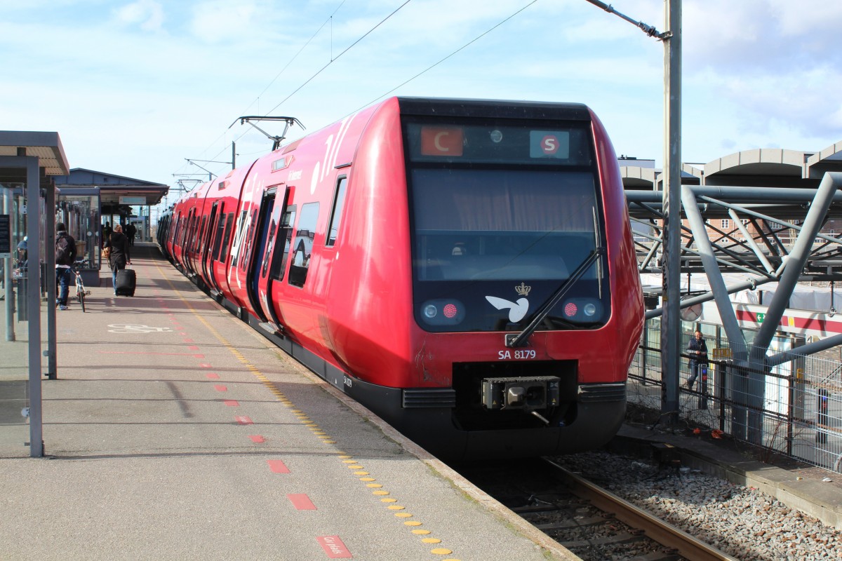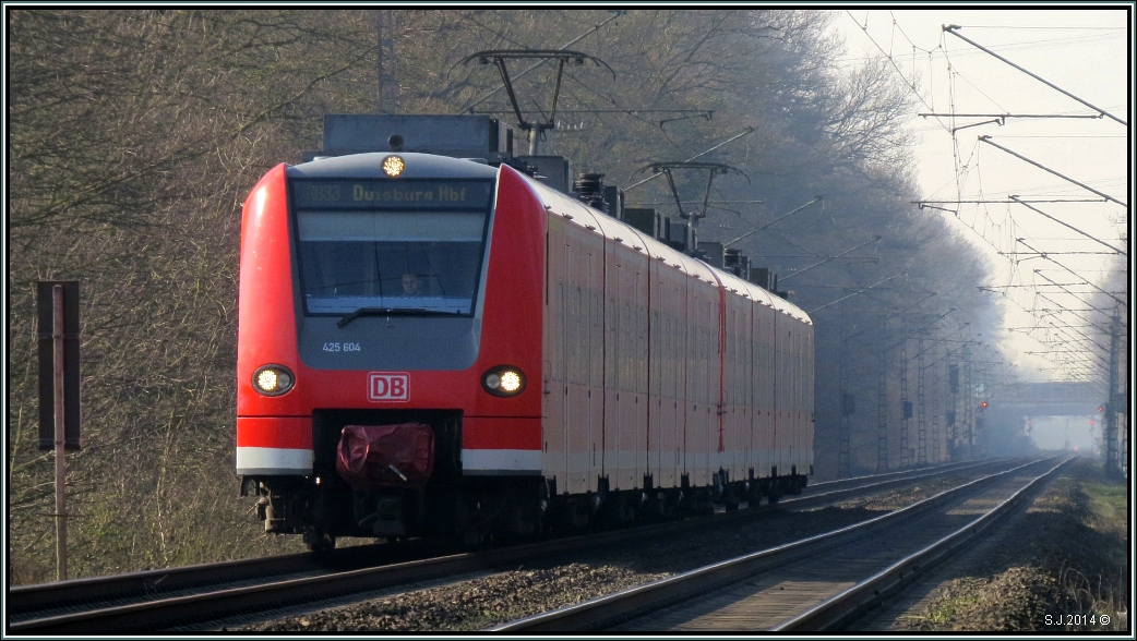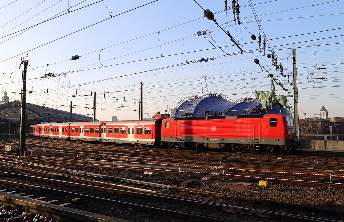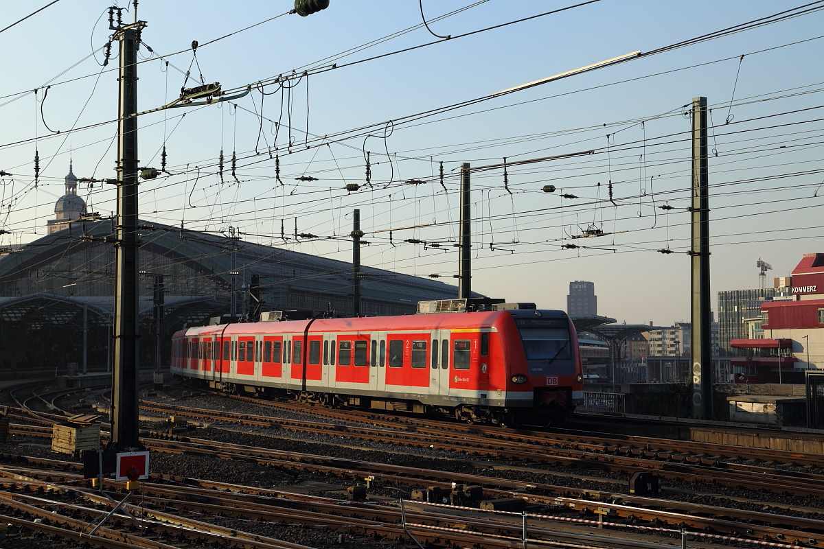 Ein Triebwagenzug der BR 423, unterwegs auf der S-Bahnlinie S13, fährt am späten Nachmittag des 13.03.2014, aus Hennef kommend und mit Fahrziel Frechen, in den Kölner Hauptbahnhof ein.