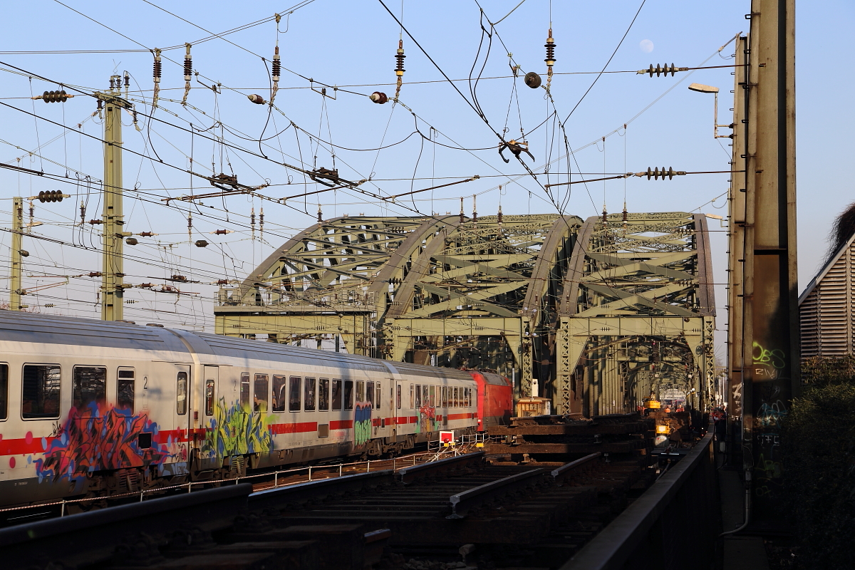 Ein unbekannter InterCity hat am späten Nachmittag des 13.03.2014 soeben den Kölner Hauptbahnhof verlassen und fährt auf die Hohenzollernbrücke. Rechts sind die zurzeit stattfindenden Bauarbeiten, zum Austausch der beiden südlichen Gleise, auf dem Bauwerk zu erkennen, welche noch bis Mitte April andauern und den Zugverkehr erheblich behindern werden.