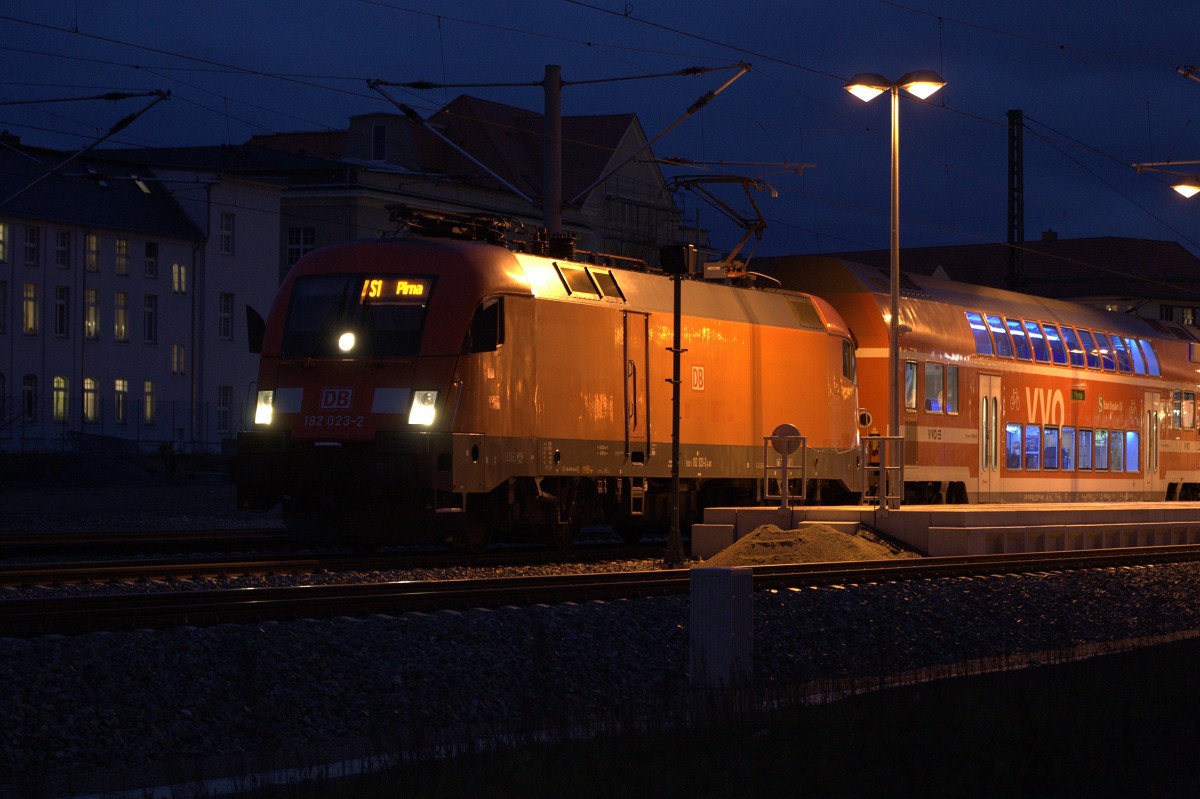 Ein Zug der Linie S1 gezogen von 182 023 - 2 in Radebeul Ost. 16.03.2014 18.42 Uhr.