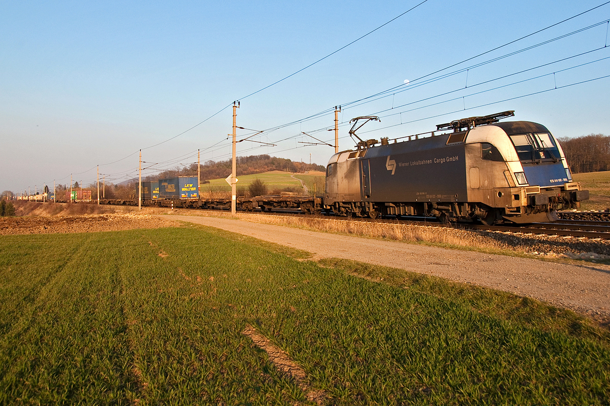 ES 64 U2-066 der Wiener Lokalbahnen Cargo GmbH, unterwegs mit Containern in Richtung Westen. Neulengbach, am 14.03.2014.