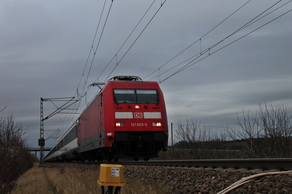 Hier 101 037-0 mit IC2388 von Frankfurt(Main) Hbf. nach Berlin Ostbahnhof, bei der Durchfahrt am 15.3.2014 durch Berlin Friedrichstraße, in Richtung Berlin Alexanderplatz.