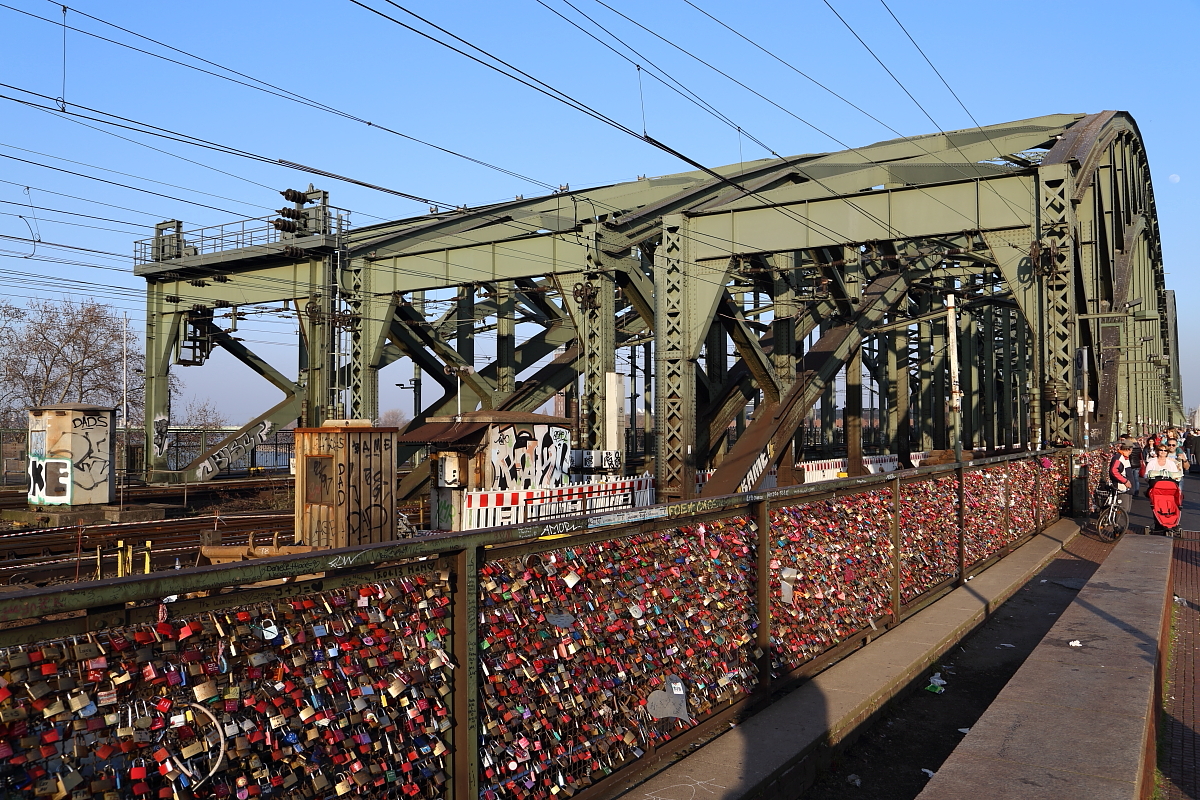 Hohenzollernbrücke in Köln, aufgenommen am späten Nachmittag des 13.03.2014. Am Zaun im Vordergrund befinden sich zahllose Schlösser, welche hier seit einigen Jahren von Pärchen als Liebesbeweise angebracht werden. Danach wird der entsprechende Schlüssel, als Symbol der ewigen Treue, in den Rhein geworfen. Aber aus eigener Erfahrung kann ich sagen, dass man den Tipp von der Kölner Band  Höhner  ernstnehmen und immer einen Zweitschlüssel dabeihaben sollte!!! (Song  Schenk mir Dein Herz ) ;-)))
