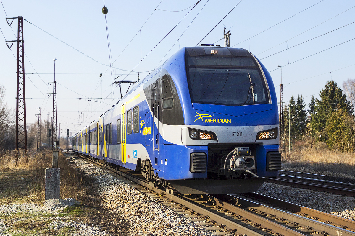 Meridian ET 311 durchfährt am 14.03.2014 mit einem IC auf Gleis 5, dem durchgehenden Hauptgleis der Relation München - Rosenheim, den Bahnhof Grafing bei München ohne Halt. Hersteller: Stadler, Berlin Fabriknr.: 39497 Abnahmedatum: 03.01.2014 Erst-Bw: München UIC-Nr.: 94 80 1430 011-5 D-BOBY Betreibernr. z.Z.d. Aufnahme: ET 311