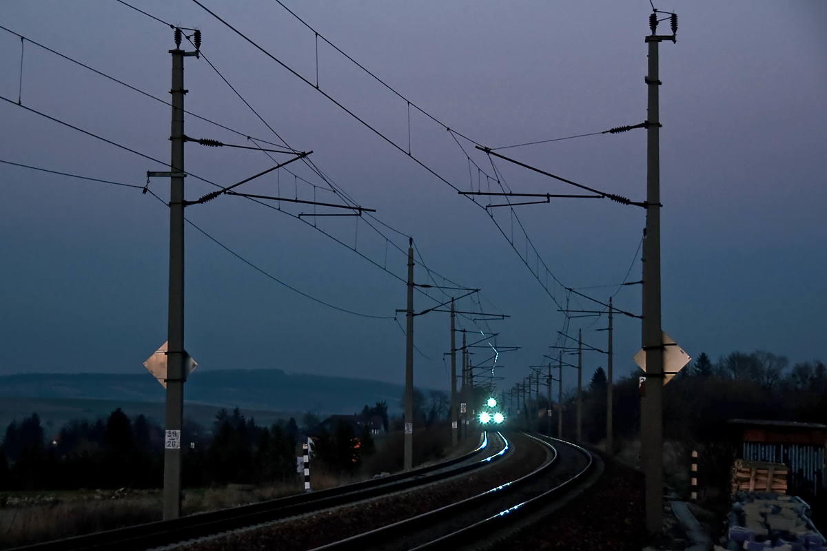 Schon von Weitem zu erkennen, die LED's von 1144 056, unterwegs mit R 2034 nach St. Pölten. Neulengbach, am 14.03.2014.