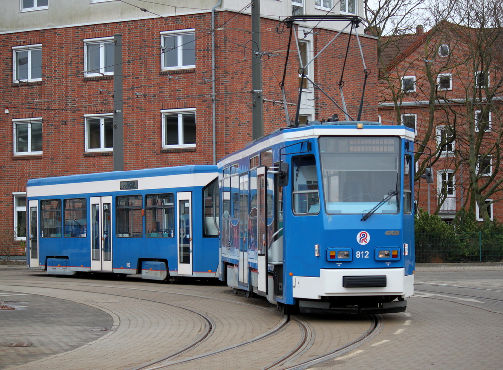 Tatra-Straßenbahn 812 und NF-Beiwage 862 mussten am 16.03.2014 auf dem Gelände der Rostocker Straßenbahn AG warten.Voraussichtlich ab mitte Mai wird dann die neue Hightech-Straßenbahn vom Typ Vossloh 6N2 auf der Linie 1 fahren.