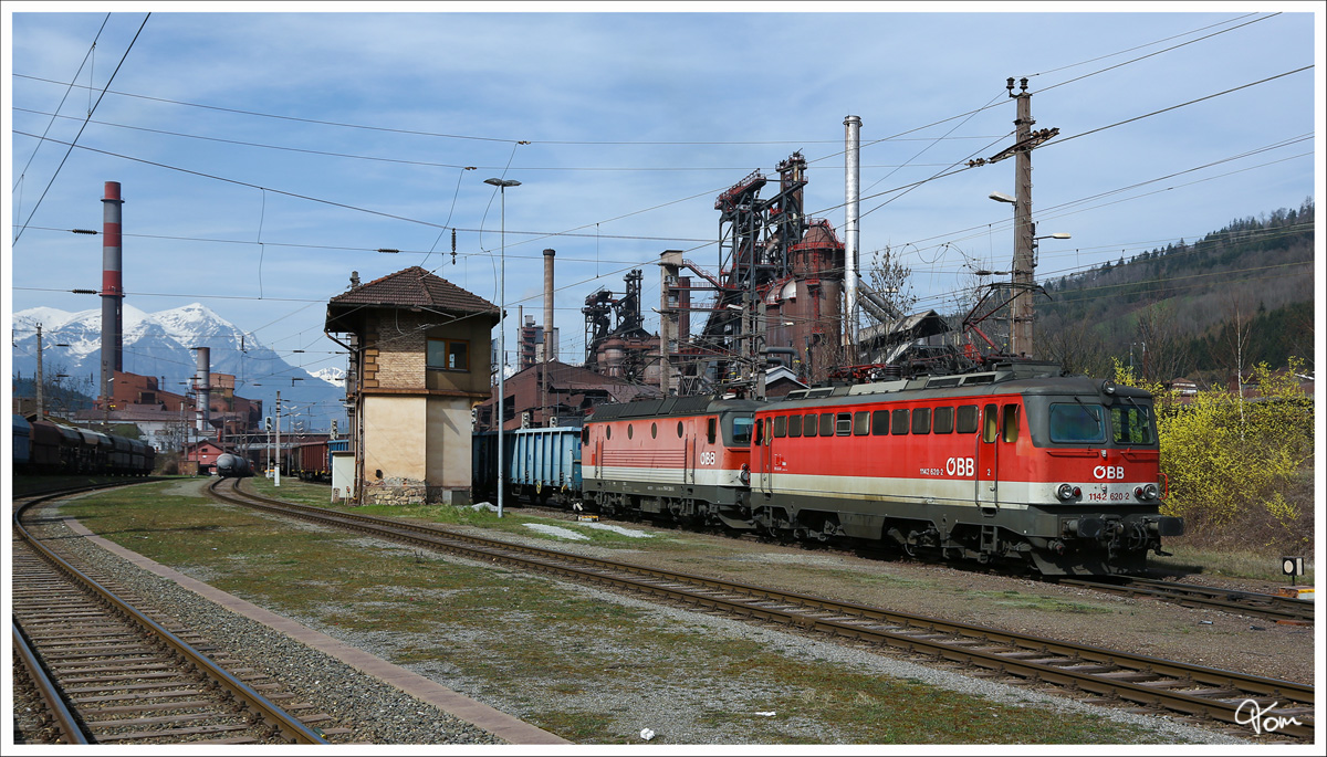 1142 620 und 1144 208 verlassen mit einem Leerzug den Bahnhof Donawitz.