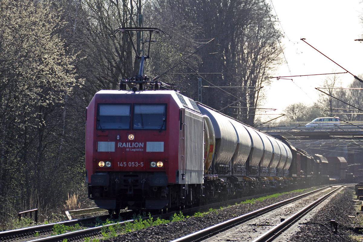 Railpool 185 674-9 und die an Novelis vermietete abgebügelte 185 696-2 sind am 20.03.2014 zwischen Allerheiligen und Nievenheim unterwegs