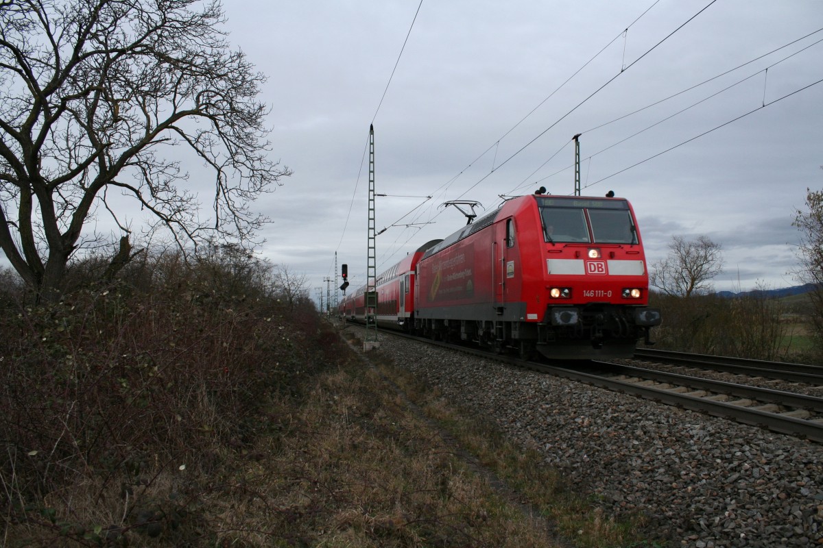 146 111-0 mit einem RE von Offenburg nach Basel SBB am Nachmittag des 14.02.14 südlich von Müllheim (Baden).