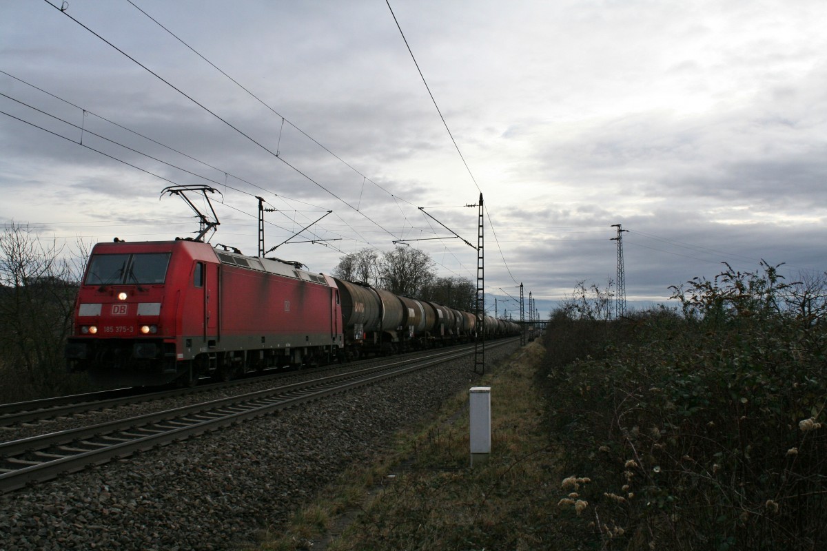 185 375-3 mit einem Kesselzug gen Norden am Nachmittag des 14.02.14 südlich des Bahnhofs Müllheim (Baden). Viele Grüße an den Lokführer!