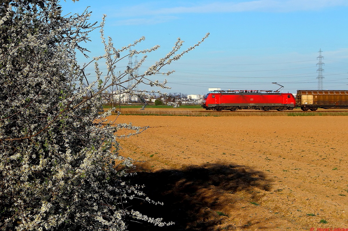 Auch am Niederrhein ist der Frühling eingezogen: Eine unbekannte DB 189 fährt am 20.03.2014 bei Nievenheim Richtung Neuss