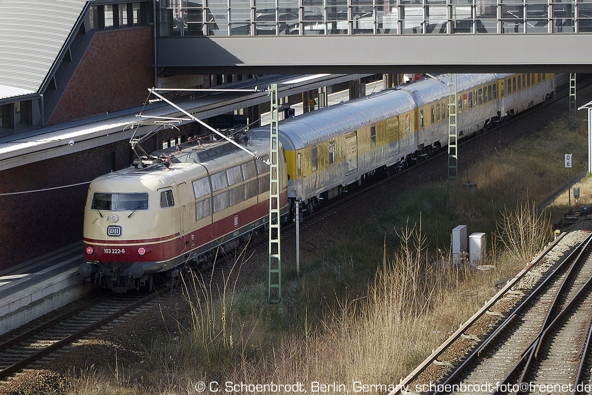 Berlin Gesundbrunnen, DB E-Lok 103 222-6 mit Messzug am Bahnsteig. 20. März 2014