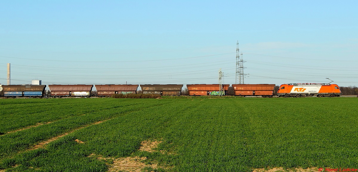 Eine ES64U4 der RTS Swietelsky fährt bei Neuss-Allerheiligen in Richtung Süden (20.03.2014)