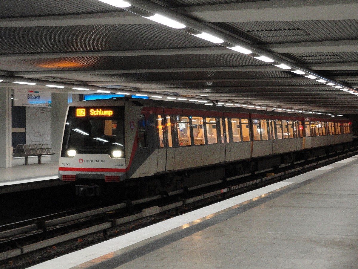 Hamburg am 24.1.2014: DT4 137 auf der U2 nach Schlump im U-Bahnhof Billstedt um 22:55 Uhr