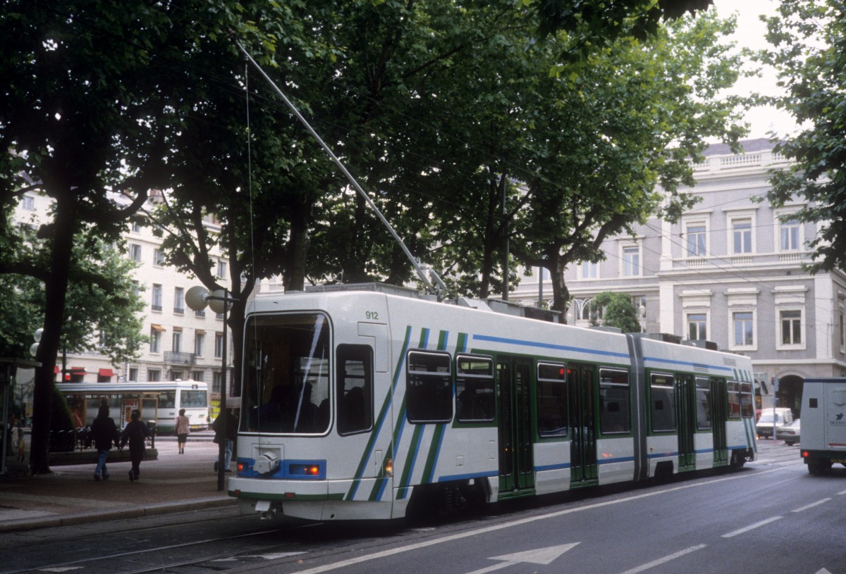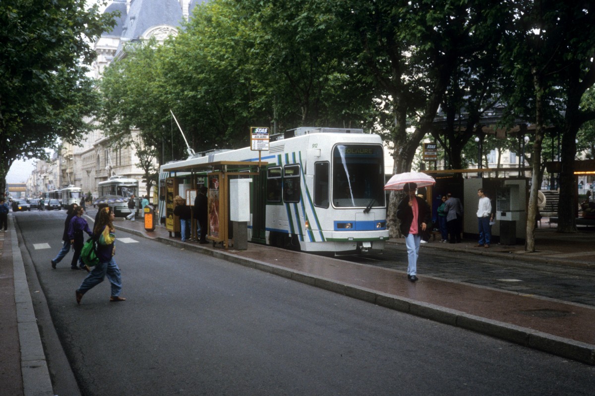 Saint-Étienne STAS SL 4 (GEC Alstohm/Atéliers Mécaniques de Vevey-Niederflur-Gelenktriebwagen 912) Place Jean Jaurès im Juli 1992.