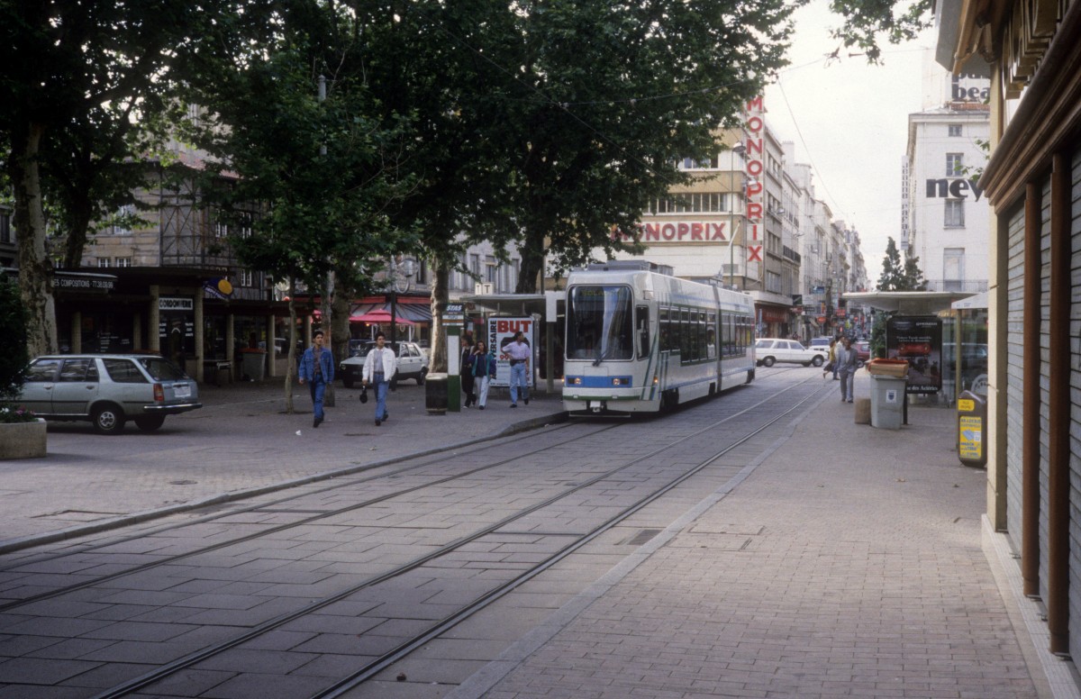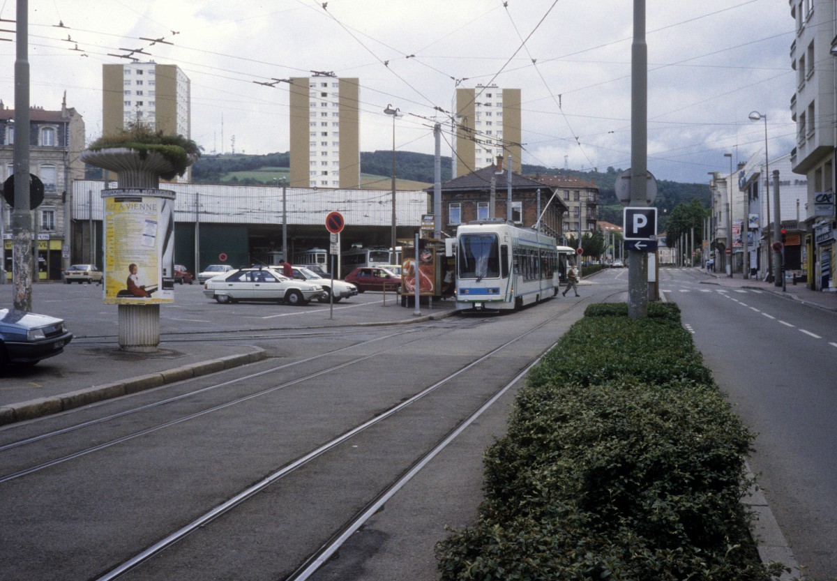 Saint-Étienne STAS SL 4 (GEC Alstohm/Atéliers Mécaniques de Vevey-Niederflur-Gelenktriebwagen) Place Bellevue im Juli 1992.