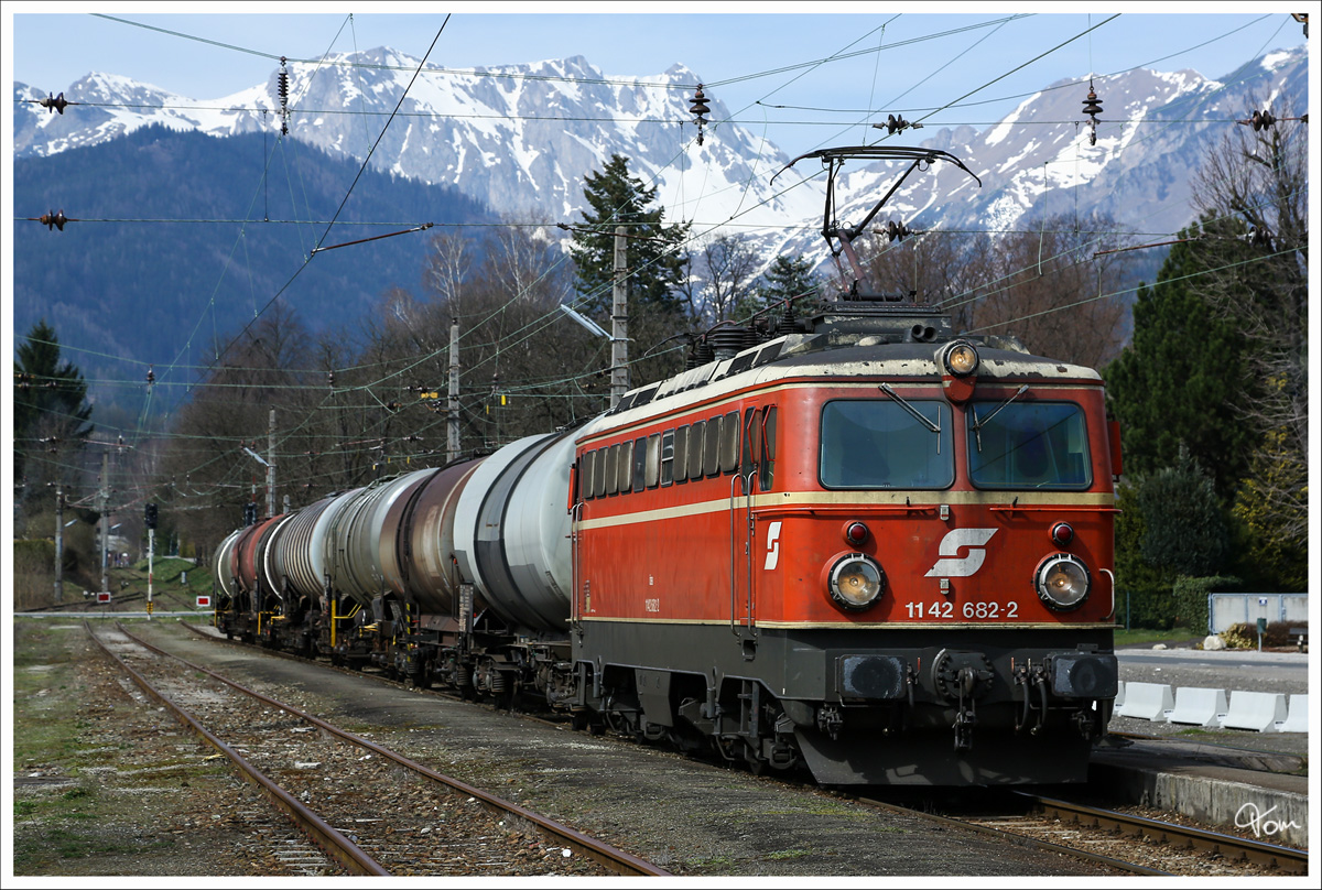 1142 682 rollt mit dem Ölzug 76674 von Trofaiach nach Donawitz. Trofaiach 21.3.2014